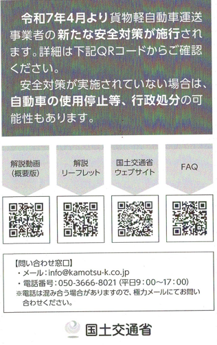 これは、【2024年1月号】【2024年11月号】でご紹介した「軽貨物運送における安全対策の為の制度改正」による規制がいよいよ来月1日より始まる為のお知らせです。