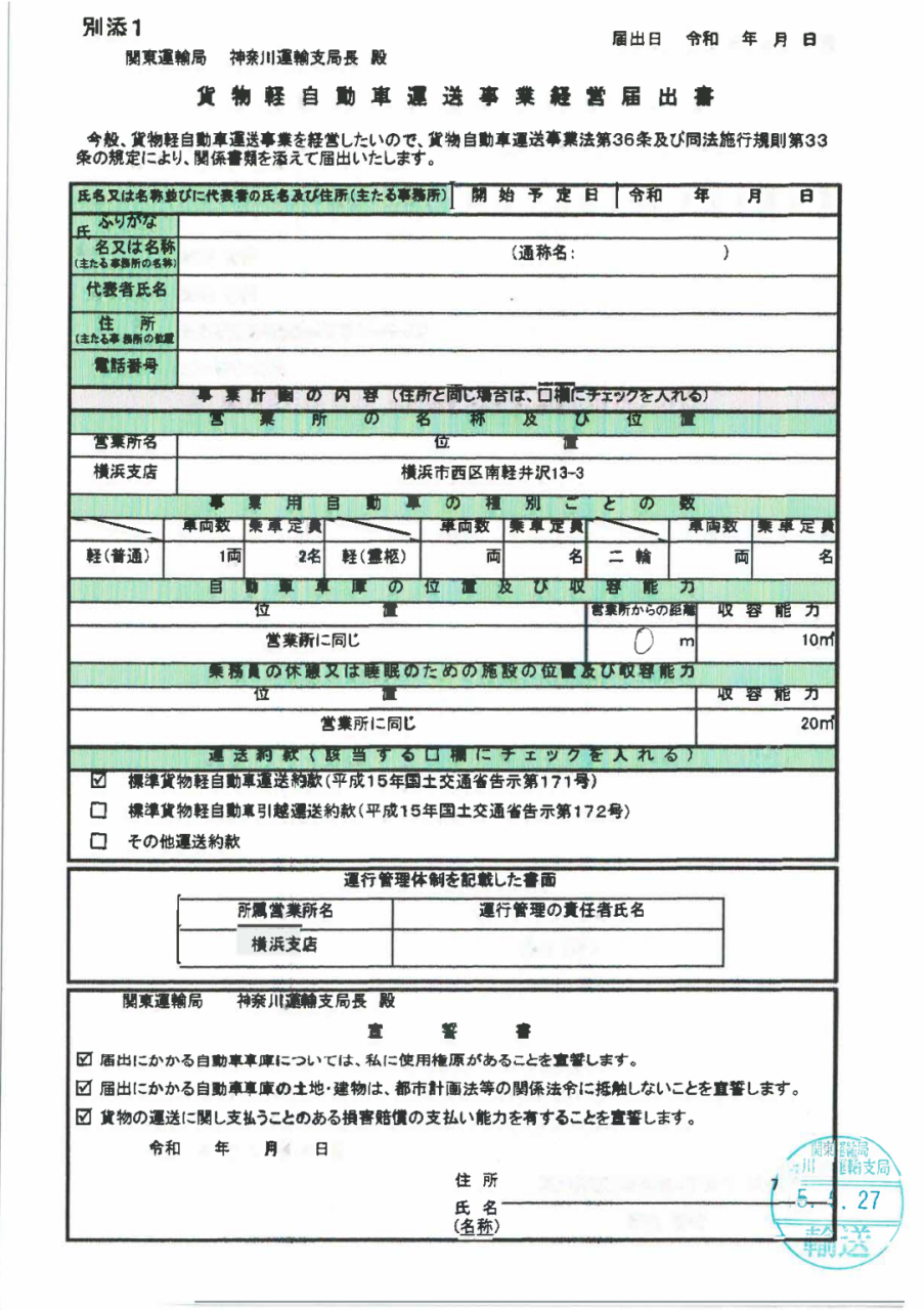 営業ナンバーを取得手続きを自分でした方はどこの運輸支局か分かると思いますが、ディーラーやアスリートで手続きをしている方は、貨物軽自動車運送事業経営届出書(過去何回か紹介している【84号他】重要書類の一つ)を見て自分の管轄の運輸支局を把握しましょう。